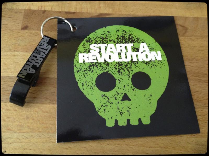 Das Ganze kommt auf ner geilen quadratischen Karte, die vorne ein Aufkleber ist. Daran hängt ein Flaschen- und Dosenöffner aus eloxiertem Alu mit unserem Logo als Lasergravur. Davon gibt es nur limitierte 100 Stück und das war’s!